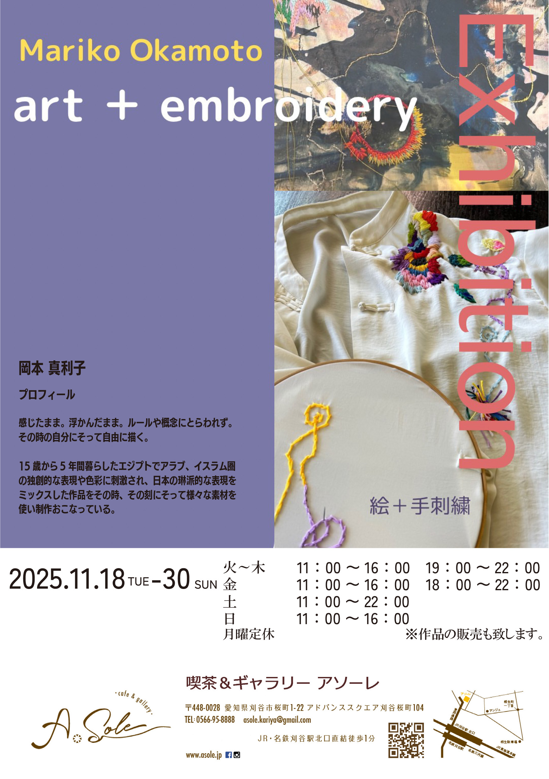 11/18(水)~11/30(日) 岡本 真利子 「art + embroidery」 NEWS 2025.11.06 久しぶりにギャラリー展示をいたします。 画家岡本真利子さんの個展をやります。 今回は、絵画と刺繍です。ジ ャケット、シャツに素敵に刺繍された物を展示即売いたします。 真利子さんの絵の作風は、独創的で魅力ある作品ばかり。 ぜひ、ご来店いただき、作品の魅力を感じてください。 作家在廊日は随時お知らせいたします。